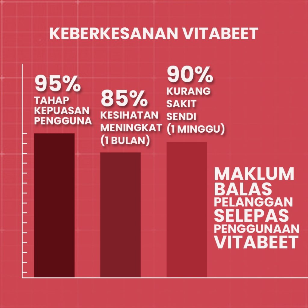 VitaBeet bukan sekadar jus biasa. Ia diformulasikan dengan gabungan 4 ekstrak superfood klinikal, Vita Beet bukan sekadar minuman kesihatan biasa. Ia bertindak dari akar masalah iaitu melancarkan peredaran darah, aktifkan nitrik oksida, dan bantu kurangkan tekanan darah & keradangan sendi secara semula jadi.